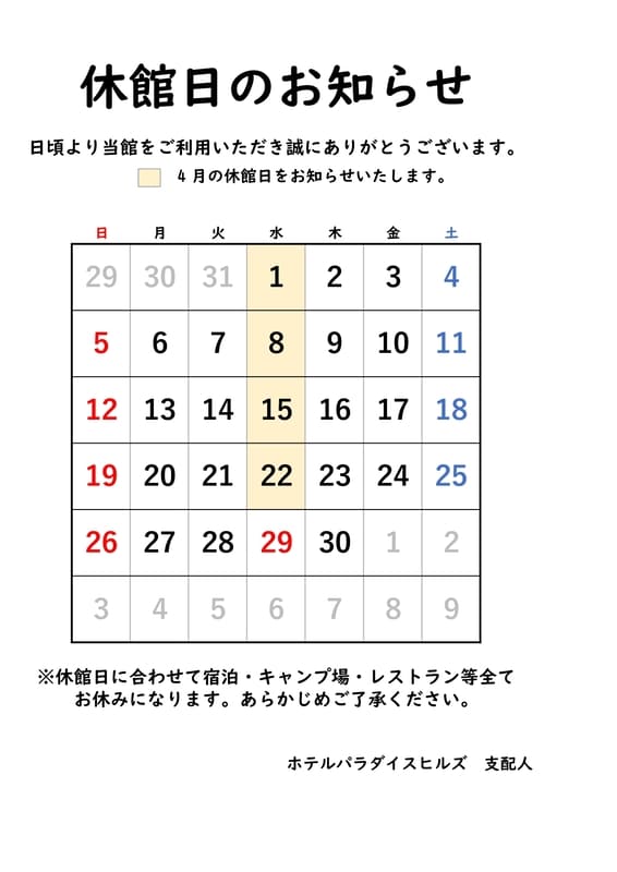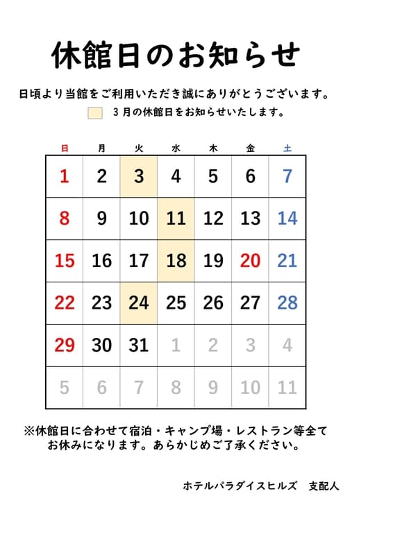 それに伴い【休館日前日のご宿泊について】のご案内をいたします。