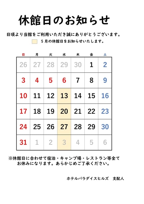 それに伴い【休館日前日のご宿泊について】のご案内をいたします。