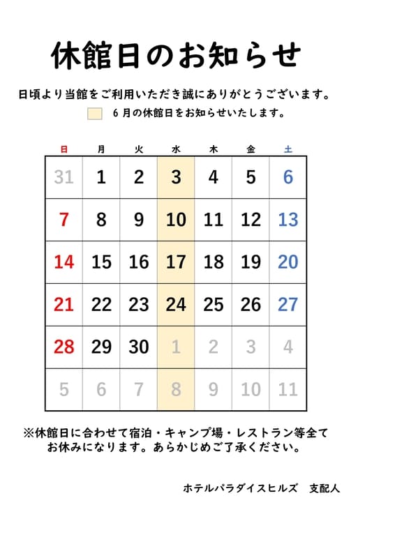 令和8年4月~令和8年6月の休館日のお知らせ